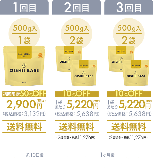 - ※初回は1袋お届けし、2回目は約10日後に2袋お届け、3回目以降は1ヶ月おきに2袋ずつお届けいたします。