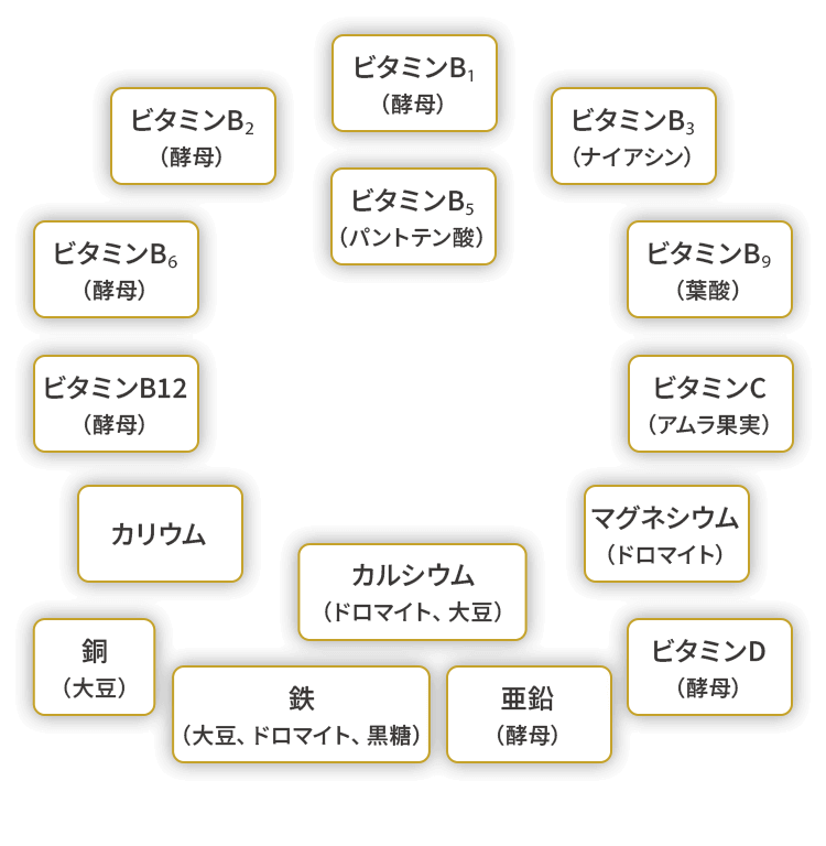 原材料名:粉末状大豆たん白(国内製造)、加工黒糖、きな粉、 酵母、ドロマイト、酵母由来食物繊維、米粉(グルコシルセラミド含有)、イソマルトオリゴ糖粉あめ、有機アガベイヌリン、アムラ果実エキス末、デキストリン、乳酸菌混合末(ビフィズス菌5種、乳酸菌17種)、亜鉛含有酵母、鉄含有酵母、パントテン酸含有酵母、ビタミンD含有パン酵母、乳糖(一部に乳成分・大豆を含む)