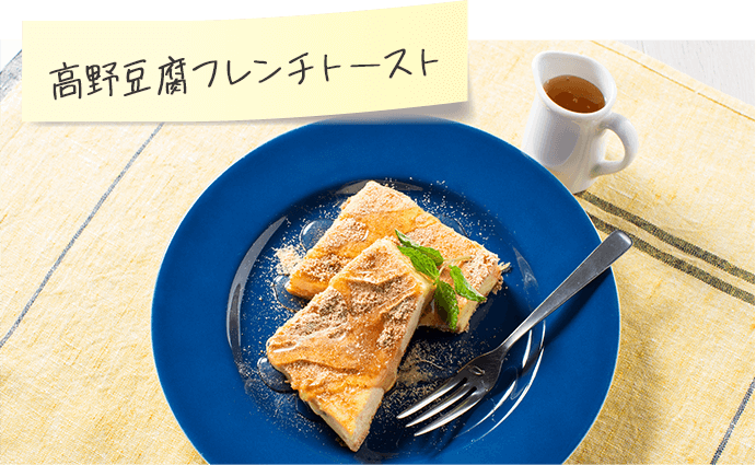1.高野豆腐を水またはぬるま湯で柔らかくなるまで戻し、水気を切っておく。 2.ボウルに(A)を入れてよく混ぜ、平たい耐熱皿に卵液を入れて1.の高野豆腐を浸し、600wの電子レンジで両面45秒ずつ加熱する。 3.弱火にしたフライパンにバターを入れ、2.を加え、蓋をして両面を4分ずつ焼色がつくまで蒸し焼きにする。 4.3.をカットし、OISHII BASEでまぶしたら皿に盛り付け、お好みでメープルシロップとミントをのせる。