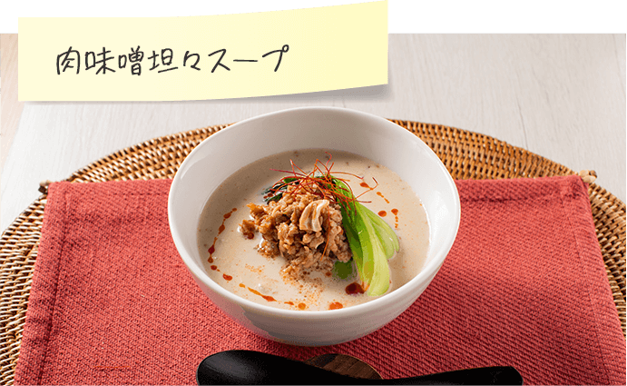 <次に鶏ひき肉の中華風肉味噌を作ります> 4.えのきは1cmずつにカット、長ねぎはみじん切りにする。ナッツは砕いておく。 5.耐熱ボウルに(B)をすべて合わせ、ひき肉、えのき、長ねぎ、ナッツを加え、全体を混ぜ合わせてふんわりラップし600wのレンジで3分加熱する。 6.全体に火が通っているのを確認し、ゴマ坦々スープに盛り付けて完成。